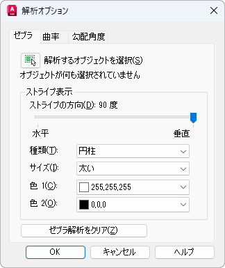 このダイアログ ボックスの各タブには、次の 3 種類のソリッドとサーフェス解析を調整するための設定が含まれています: ゼブラ(連続性)、曲率、勾配角度。