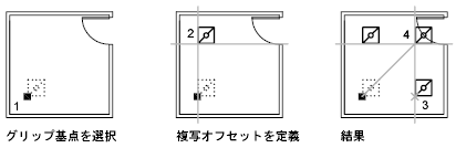 連続複写するには、[Ctrl]を押しながら 1 点目を指定する方法もあります。たとえば、ストレッチ グリップ モードを使用している場合、線分などのオブジェクトをストレッチすると同時に、そのオブジェクトを複写し、作図領域の任意の点に配置することができます。グリップをオフにするまで、オブジェクトが連続複写されます。