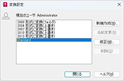リストに表示されている変換設定の名前を変更します。変更できるのは、作成した変換設定の名前のみです。変換設定 Standard の名前は変更できません。