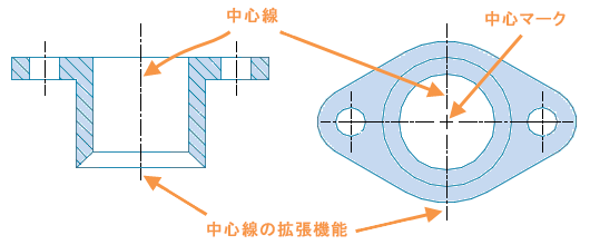 中心マークと中心線は、寸法記入時に基準とする、穴の中心や対称の軸です。
