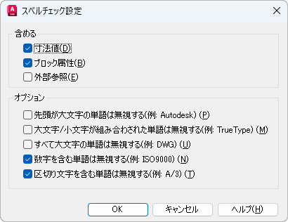 図面でスペルチェックする文字に関するオプションを指定します。