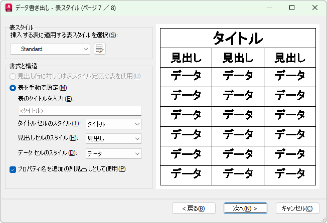 データ書き出し表の外観をコントロールします。このページは、[出力を選択]ページで[AutoCAD の表]が選択された場合にのみ表示されます。