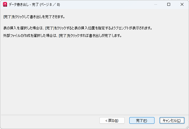 書き出しデータが入力された表を作成します。[完了]ページの[完了]ボタンをクリックすると、現在の図面に表を挿入するよう求めるプロンプトが表示されます。