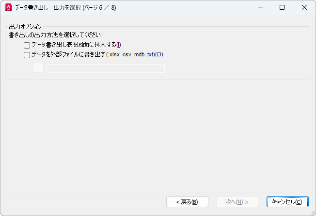 データを書き出す図面ファイルをフォルダも含めて指定します。現在の図面から情報を書き出すオブジェクトを選択できます。