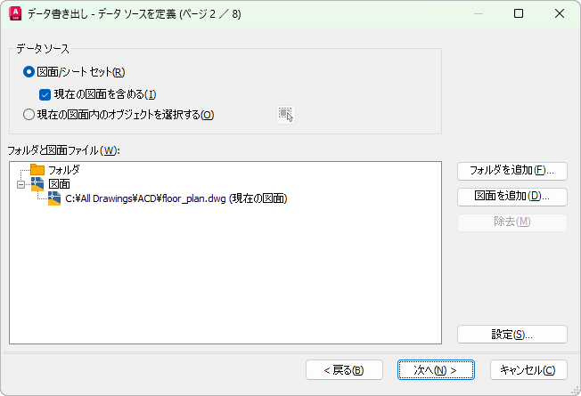 データの書き出しに現在の図面を含めます。他の図面を書き出し対象として追加する場合は、現在の図面は空(オブジェクトを含まない状態)でもかまいません。