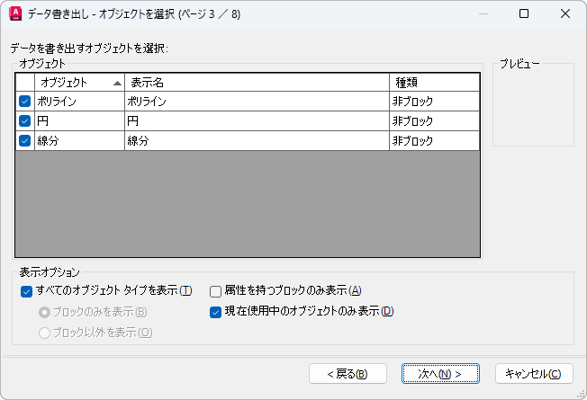 このオプションを選択すると、[現在の図面からオブジェクトを選択]ボタンが有効になるので、データを書き出すオブジェクトを選択できます。