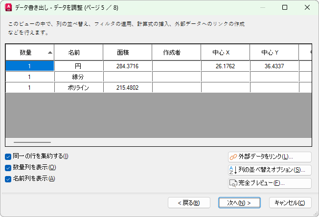 これらの情報を使用して、現在の図面にデータ書き出し表を作成または外部ファイルに保存のいずれかまたは両方の作業ができます。