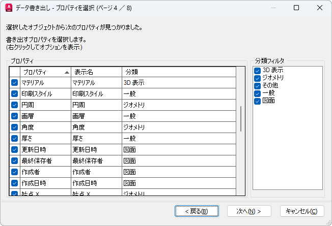 [プロパティ]一覧から書き出す分類を一覧表示します。チェック マークの付いていない分類でプロパティの一覧をフィルタします。分類には、3D 表示、属性、図面、ダイナミック ブロック、一般、ジオメトリ、その他、パターン、表、テキストがあります。
