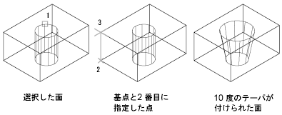 指定した角度で 3D ソリッドの面にテーパを付けます。テーパ角度の回転は、選択したベクトルに沿った、基点と 2 番目の点の選択の順番で決定されます。