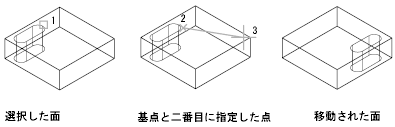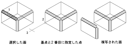リージョンまたはボディとして面を複写します。2 つの点を指定した場合は、最初の点が基点として使用され、その基点を基準にコピーが 1 つ作成されます。通常は座標として入力し、その後で[Enter]を押して 1 点を指定した場合、その座標は新しい位置として使用されます。