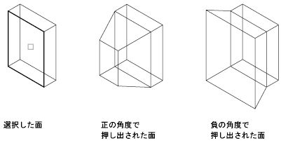 正の角度を指定すると面を狭めるようにテーパが付き、負の角度を指定すると面を広げるようにテーパが付きます。既定の角度は 0(ゼロ)で、この場合、面は平面に垂直に押し出されます。選択セット内の選択した面はすべて、同じ値でテーパが付けられます。