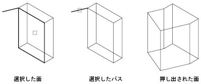 指定された線分や曲線を基にして押し出しパスを設定します。選択した面のすべての外形線が選択したパスに沿って押し出され、押し出しを作成します。