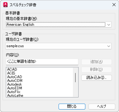 辞書を管理します。スペルチェック中は、図面内の単語と、現在の基本辞書およびカスタム辞書内の単語とが比較されます。[追加]オプションを使用して指定した例外スペルは、現在使用しているユーザ辞書に保存されます。
