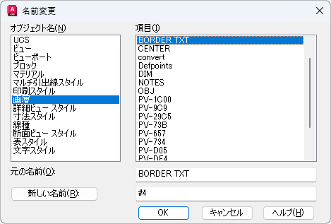 画層や寸法スタイルなどの名前の付いたオブジェクトに割り当てられている名前を変更します。