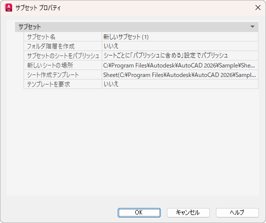 このサブセットの新しい図面ファイルを作成する場合に使用する図面テンプレート(DWT)ファイルとレイアウト名を指定します。