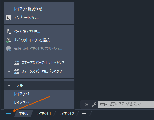 - 作図領域のスペースを最適化するには、[モデル]タブまたはレイアウト タブを右クリックし、[ステータス バー内にドッキング]を選択します。[モデル]タブとレイアウト タブは、ステータス バーと同じ行内に表示されます。