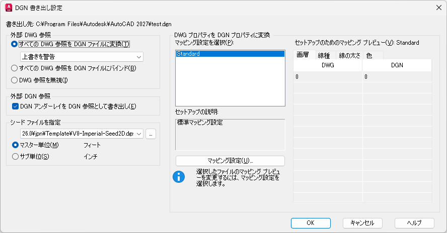 現在の DGN 書き出しに使用するマッピング設定を選択および管理します。