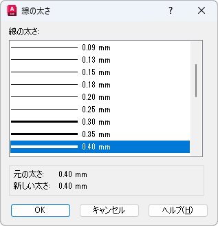 画層に適用可能な線の太さが表示されます。使用可能な線の太さは、図面で最もよく使用される固定値で構成されています。画層に適用する線の太さを選択します。