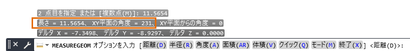 計測結果は、コマンド ウィンドウに表示されます。必要に応じて、[F2]を押してコマンドウィンドウを展開します。