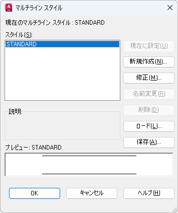 既定のマルチライン スタイル名 STANDARD、現在のマルチライン スタイル、使用中のマルチライン スタイルを削除することはできません。