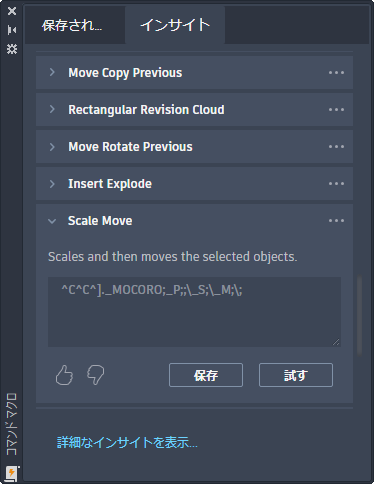 [インサイト]タブで以前に保存したコマンド マクロが含まれます。