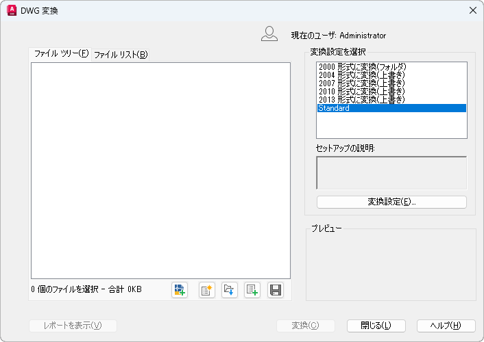 標準のファイル選択ダイアログ ボックスが表示されて、図面ファイルを選択して変換リストに追加できます。このボタンは[ファイル ツリー]タブと[ファイル リスト]タブの両方で使用可能です。