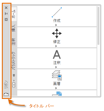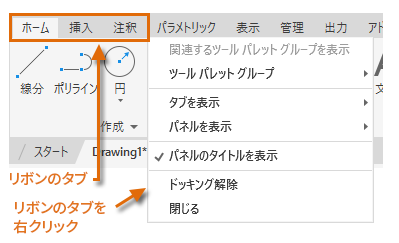 タイトル バーをクリックし、ドッキング解除されているリボンを作図領域の左端、右端、または一番上にドラッグします。
