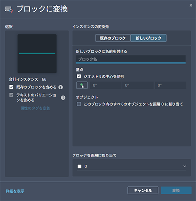 ジオメトリまたはそのインスタンスを既存のブロックに変換する場合、現在の図面からブロックを直接選択できます。または、[変換]ダイアログ ボックスで、次の中から選択します。