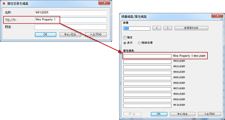 水平および垂直の線番ブロックには[線番]属性が必要です。これらのブロックには、[W01USER]から[W10USER]の属性を指定することもできます。これらの属性を使用すると、配線にさまざまなプロパティを割り当てることができます。線番ブロックで[W01USER]から[W10USER]の属性のいずれかのプロンプト値を定義した場合、線番を編集して値を割り当てると、ラベルにプロンプトが含められます。