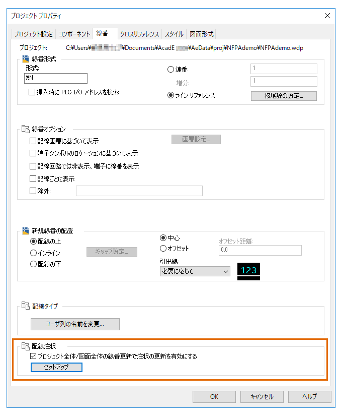 [配線注釈]セクションで、プロジェクト全体または図面全体の線番更新による注釈の更新を有効にするには、チェックボックスをオンにします。