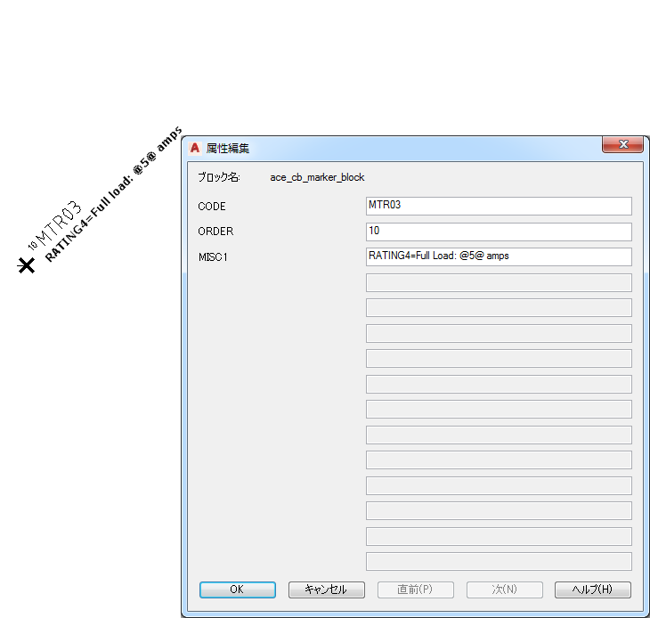 - 形式「{属性名}=@#@」を使用して、その MISC1 属性値を編集します。「#」を正しい要素にマッピングする適切なインデックス数で置き換えます。たとえば、容量を RATING2 属性にマッピングするには、「RATING2=HP: @1@」と入力します。さらに、全負荷電流値を RATING4 属性にマッピングするには、「RATING2=HP: @1@;RATING4=Full load: @7@ amps」と入力します。インデックス付けされた値のリストはゼロが基準であることに注意してください。
