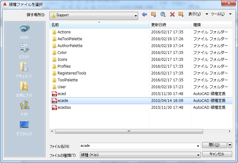 - [線種ファイルを選択]ダイアログ ボックスで acade.lin を選択して[開く]をクリックします。