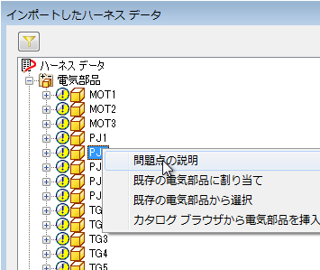 [インポートしたハーネス データ]ダイアログ ボックスのブラウザ ノードには、AutoCAD Electrical toolset から読み込んだ電気コンポーネントが含まれています。
