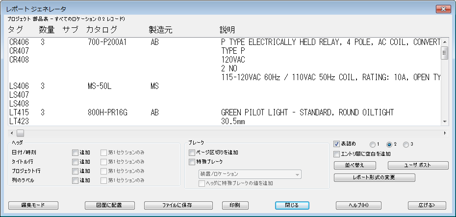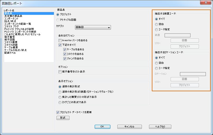 回路図レポートとパネル レポートの標準セットが用意されています。回路図レポートでは、回路図コンポーネントの情報のみが抽出されます。パネル レポートでは、パネル コンポーネントの情報が抽出されます。ただし、パネル部品表のみ、パネル レイアウトで参照されていない任意の回路図コンポーネントを含めることができます。
