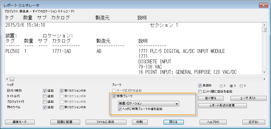 装置およびロケーションのフィルタを使用して、抽出する情報をコントロールすることができます。たとえば、顧客から提供されたすべてのコンポーネントに CUSTOMER というロケーション コードを割り当てると、ロケーション コードを使用して、レポートにフィルタを適用することができます。特定の値でレポートにフィルタを適用するには、レポート ダイアログ ボックスのロケーションと装置の[コード指定]を使用します。