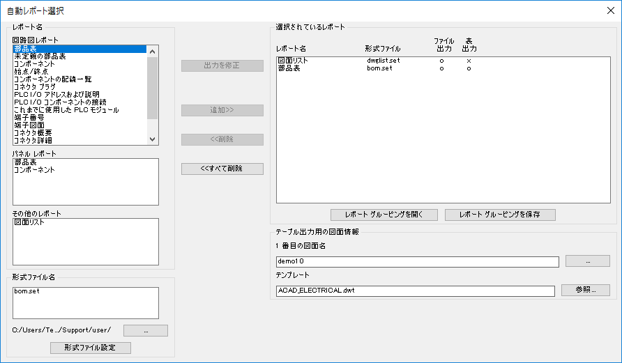 実行するレポートごとに、レポート名および形式ファイル(.set)を選択します。形式ファイルでは、ファイルの出力、表の出力、またはその両方を定義する必要があります。
