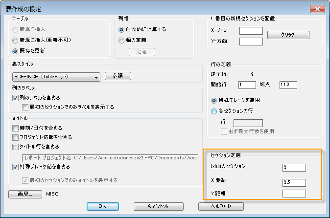 [特殊ブレーク]を選択し、[図面に配置]をクリックすると、[表作成の設定]ダイアログ ボックスで[特殊ブレークを適用]オプションが使用できるようになります。このオプションによって、[特殊ブレーク]に基づいて、各セクションの表オブジェクトが挿入されます。