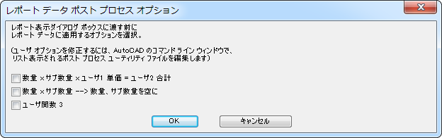 レポート タイプごとに、LISP ファイル(.lsp)およびダイアログ ボックスの定義ファイル(.dcl)が関連付けられています。これらのファイルは、レポート データのポスト プロセスを実行するためにカスタマイズすることができます。レポートを実行すると、データが[レポート ジェネレータ]ダイアログ ボックスに表示されます。[ユーザ ポスト]をクリックすると、関連付けられている .dcl ファイルで定義されたダイアログ ボックスが表示されます。ダイアログ ボックスのオプションごとの実際の処理は、関連付けられた .lsp ファイルで定義されています。