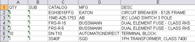 BOM データがスプレッドシート形式で表示されます。各フィールドの列に含まれているテキストをすべて表示するには、列の境界をスライドします。スプレッドシートの最初の 6 列は、前の図に示されています。最初の列は集計済み数量で、その後にサブアセンブリ数量、カタログ番号、製造元コードが続いています。残りのフィールドは、カタログ参照ファイルへの mfg/cat コンボ クエリーによって抽出されたフィールドです。