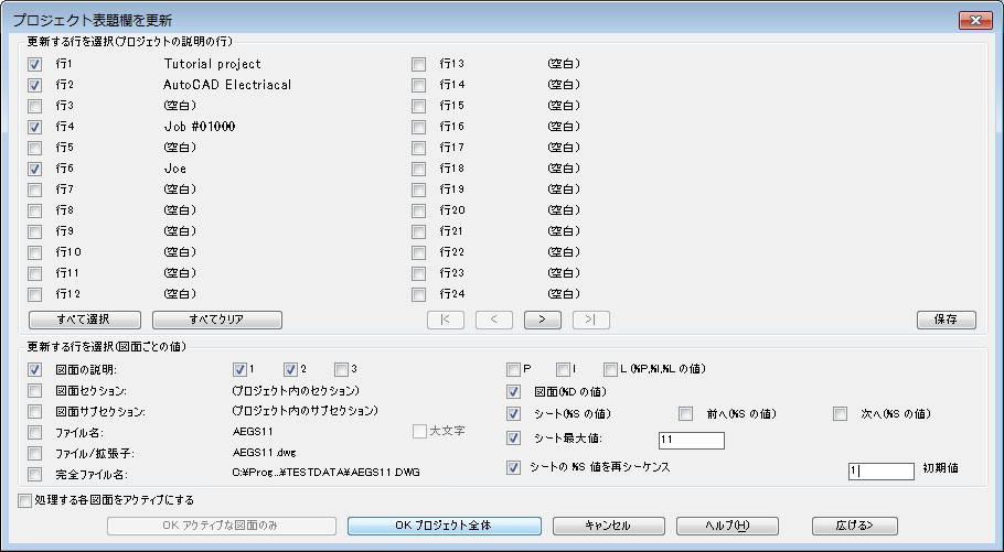 - プロジェクト表題欄で更新するプロジェクトと図面の値を選択します。