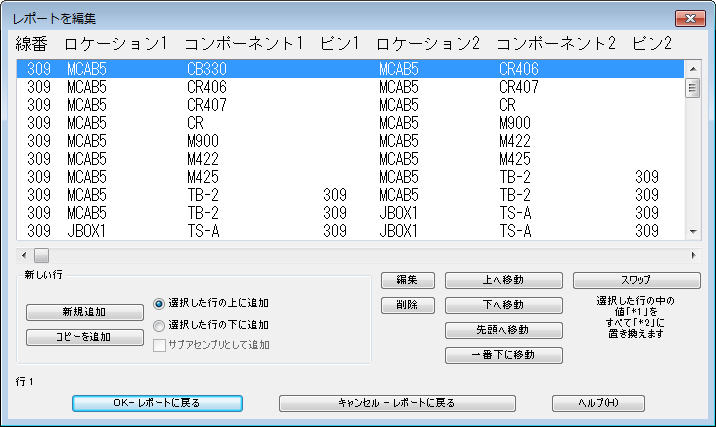 7. レポートに配線情報がある場合、レポートの各行の項目には、発側コンポーネントと着側コンポーネントと呼ばれる、2 つの接続コンポーネントを含めることができます。発側のフィールドのラベルは 1 で終了し、着側のフィールドのラベルは 2 で終了します。