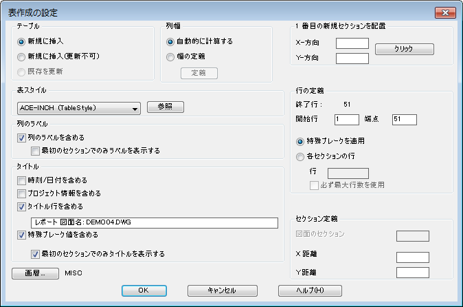 • 各図面に配置する表セクションの最大数を指定します。この指定を省略すると、1 つの図面上のセクション数が無制限になります。