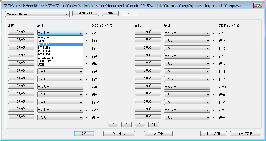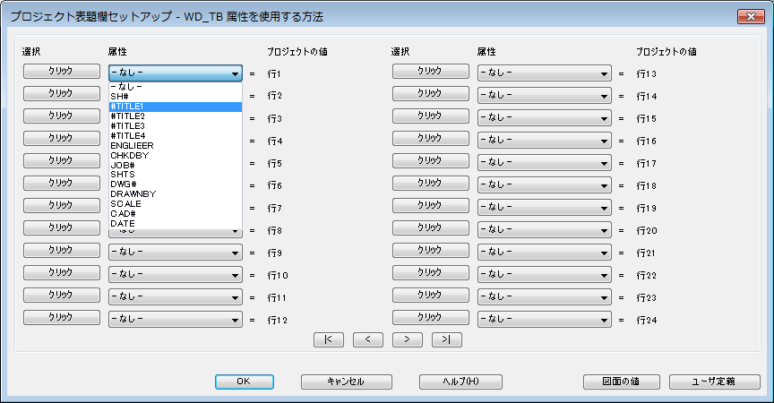 属性定義が読み込まれます。[プロジェクト表題欄設定]ダイアログ ボックスが開きます。各ドロップダウン リストには、図面から検出された属性定義オブジェクトがすべて含まれます。