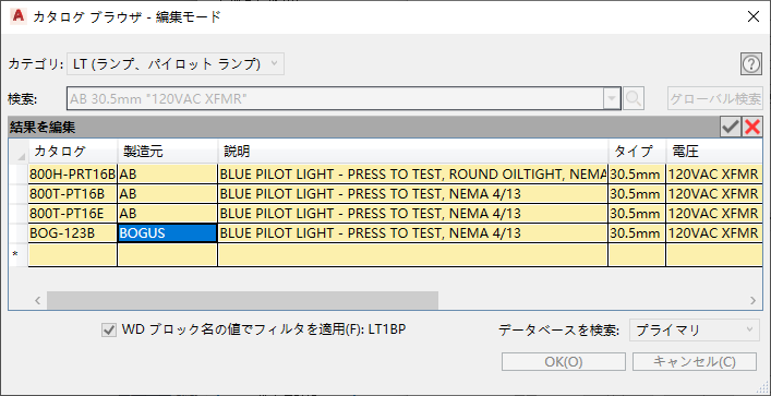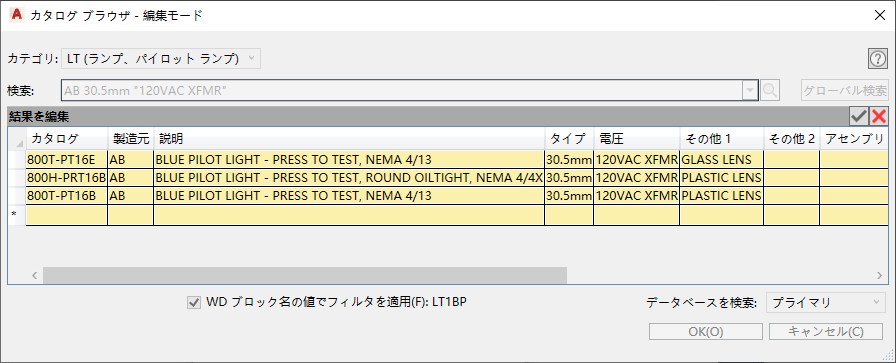 サンプルのカタログ情報が AutoCAD Electrical toolset に用意されています。カタログ情報は、Access データベース ファイル(.mdb)のテーブルに保持され、サンプルのベンダー データが入力されています。