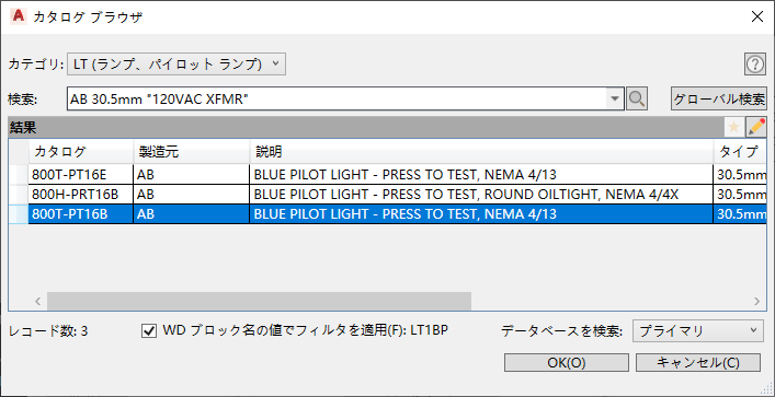 - 検索文字列 AB 30.5mm "120VAC XFMR" を入力し、