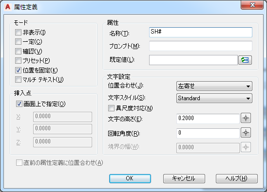 - コマンド プロンプトで ATTDEF と入力して、属性定義オブジェクトを挿入します。
