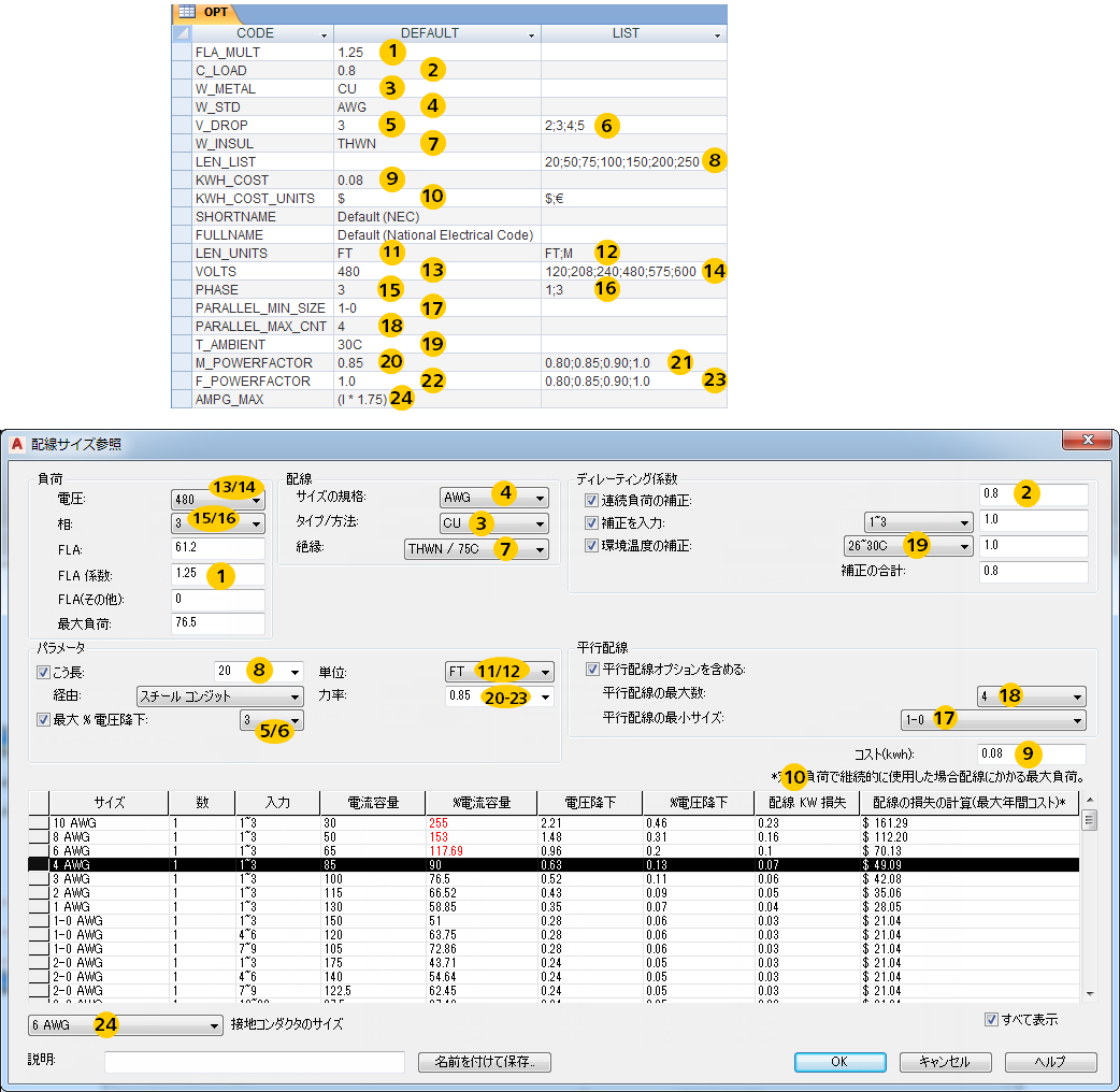 電気規格固有の既定およびオプションのリストを定義する値を含む、オプションのテーブル。たとえば、銅線、AWG サイズ規格、およびコンダクタ長の単位のフィートなどの既定が含まれます。