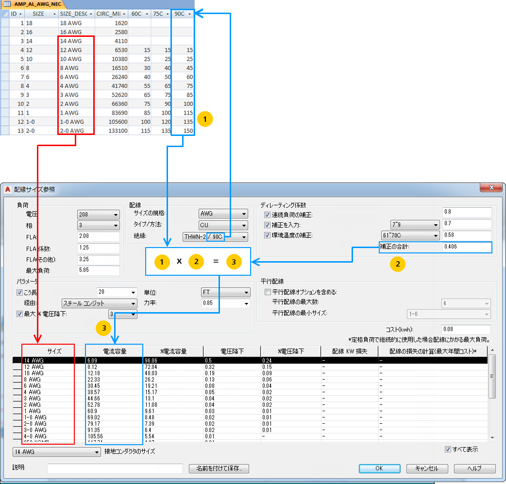 たとえば、AMP_CU_AWG_NEC には、銅の配線電流容量情報と AWG サイズが含まれ、米国電気規程の内容に対応しています。