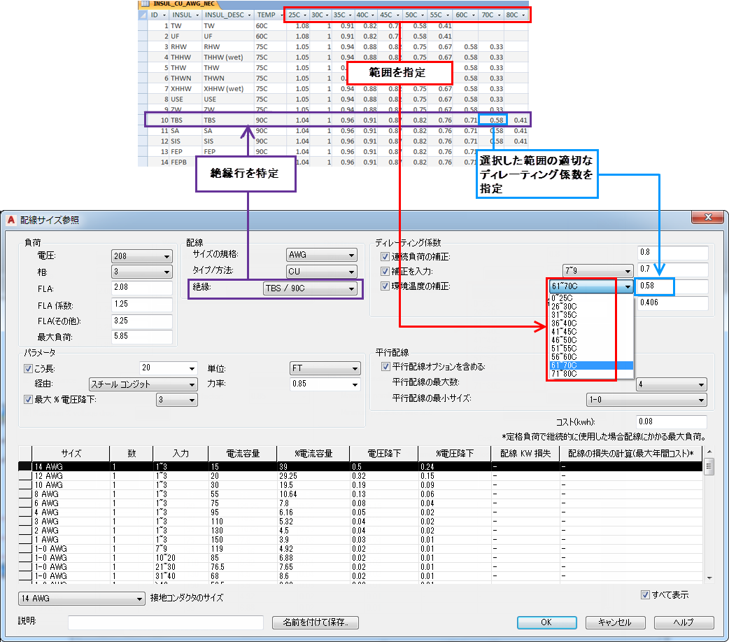 たとえば、テーブル名が INSUL_CU_AWG_NEC の場合、銅の配線絶縁情報と AWG サイズが含まれ、米国電気規程の値に対応しています。