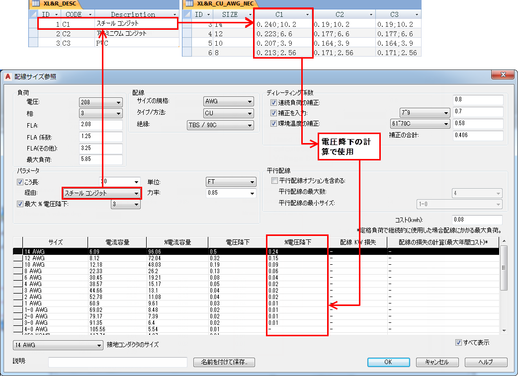 オプションのコンダクタのリアクタンス/AC 抵抗テーブルは、コンジット タイプに基づいて、配線サイズに対するリアクタンスと抵抗値を提供します。これらの値は、こう長を指定した場合に、給電配線における電圧降下の割合を計算するために使用されます。